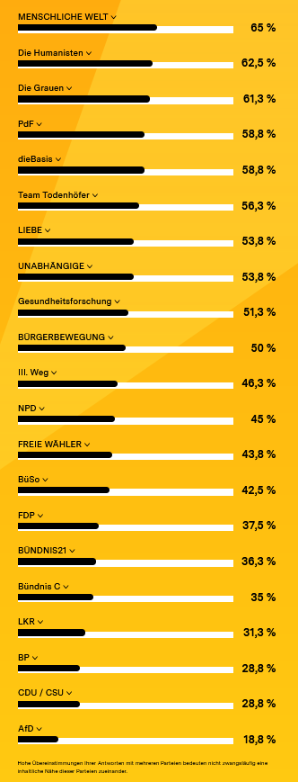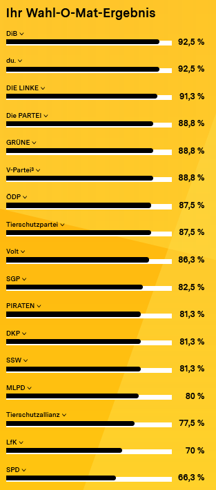 Der Wahlomat für die LTW in Sachsen. Endlich kann man direkt alle Parteien auswählen. Anders als bei der Europawahl werde ich nicht die Partei wählen. Irgendwie macht mir diese Wahl Angst und so werde ich wohl die Linke wählen. Die SPD kotzt mich so an, sich sklavisch an die Sachsen CDU zu ketten, die ja noch rechter/dümmer ist als die Bundes CDU.